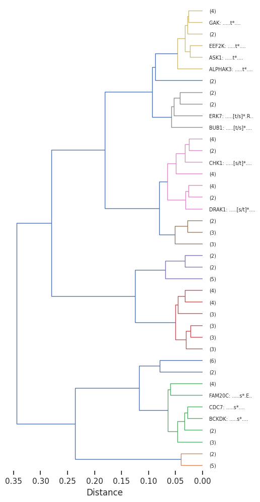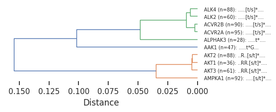 # Returns e.g.: '..RR.[s/t]*....'get_pssm_seq_labels(pssms, count_map, thr) — Generates dendrogram labels combining the PSSM index name with its consensus sequence. Optionally includes sample counts.