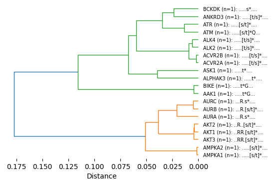 get_hcluster(pssms.head(20),func_flat=js_divergence_flat,labels=labels[:20],thr=0.125,dense=5)100%|██████████| 190/190 [00:00<00:00, 5515.69it/s]