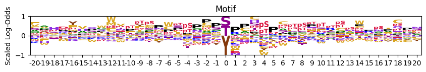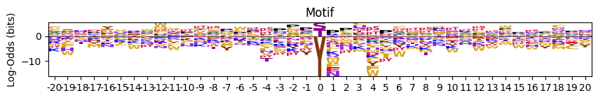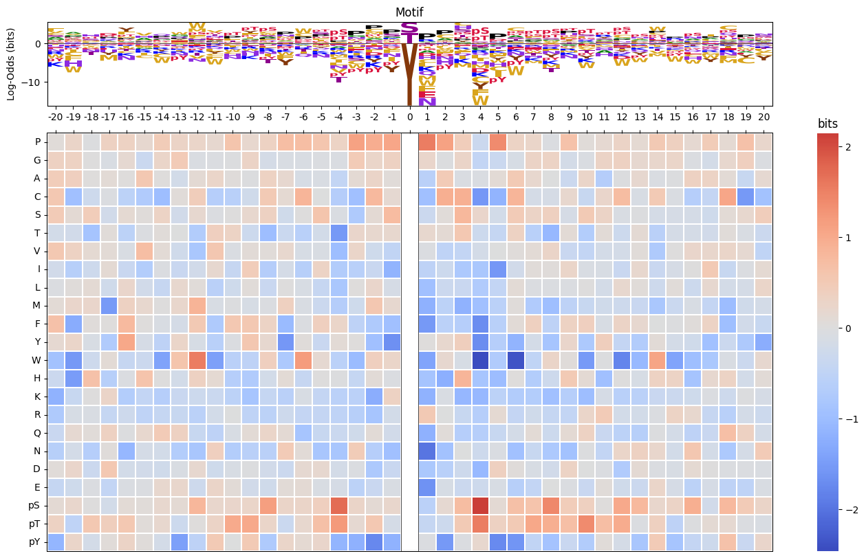 acceptor('S','T','Y', or'STY'). The function then assigns a small nonzero value (e.g., 0.1) to the corresponding phospho-residue row (pS,pT,pY) at position 0. This ensures the central letter appears in the logo plot, even when real log-odds values are absent.Stack height rescaling: To maintain visual consistency with surrounding columns, position 0 is rescaled so that its total positive and negative stack heights match the most extreme values observed elsewhere.