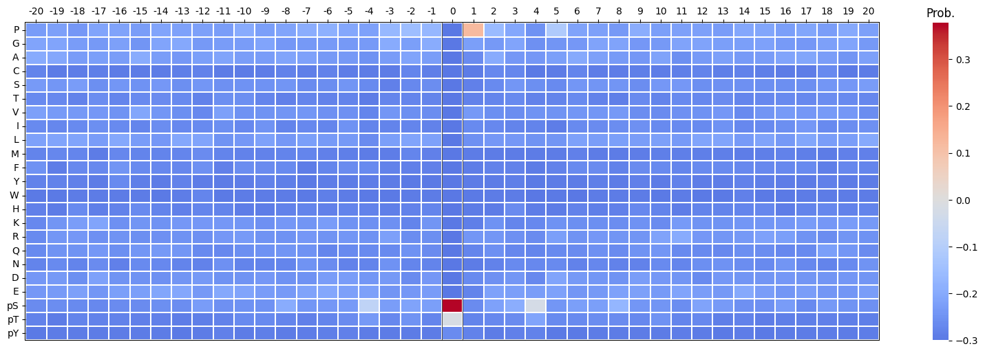 The resulting matrix has: - Rows: Amino acids, - Columns: Sequence positions (centered on the phosphosite), - Values: Probabilities of each amino acid at each position.