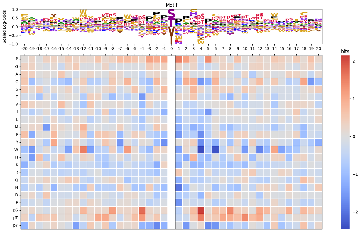 acceptor('S','T','Y', or'STY'). The function then assigns a small nonzero value (e.g., 0.1) to the corresponding phospho-residue row (pS,pT,pY) at position 0. This ensures the central letter appears in the logo plot, even when real log-odds values are absent.Stack height rescaling: To maintain visual consistency with surrounding columns, position 0 is rescaled so that its total positive and negative stack heights match the most extreme values observed elsewhere.